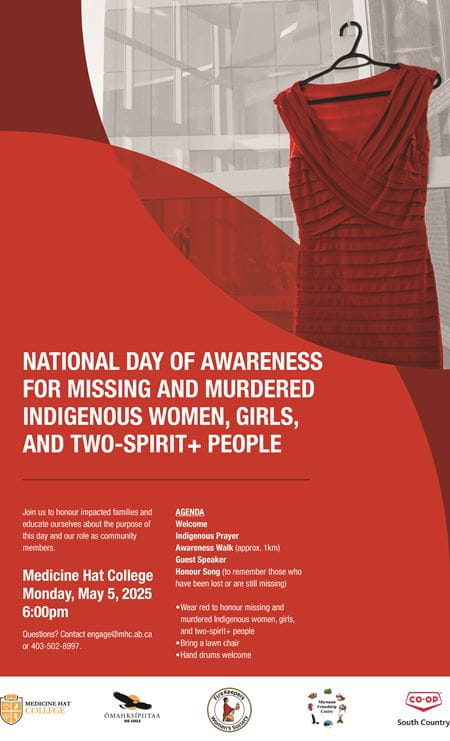 A public gathering will take place on Monday, May 5 at 6 p.m. on the MHC campus outside the main entrance. It will include an Indigenous prayer, a 1 km awareness walk, guest speaker and honour song.